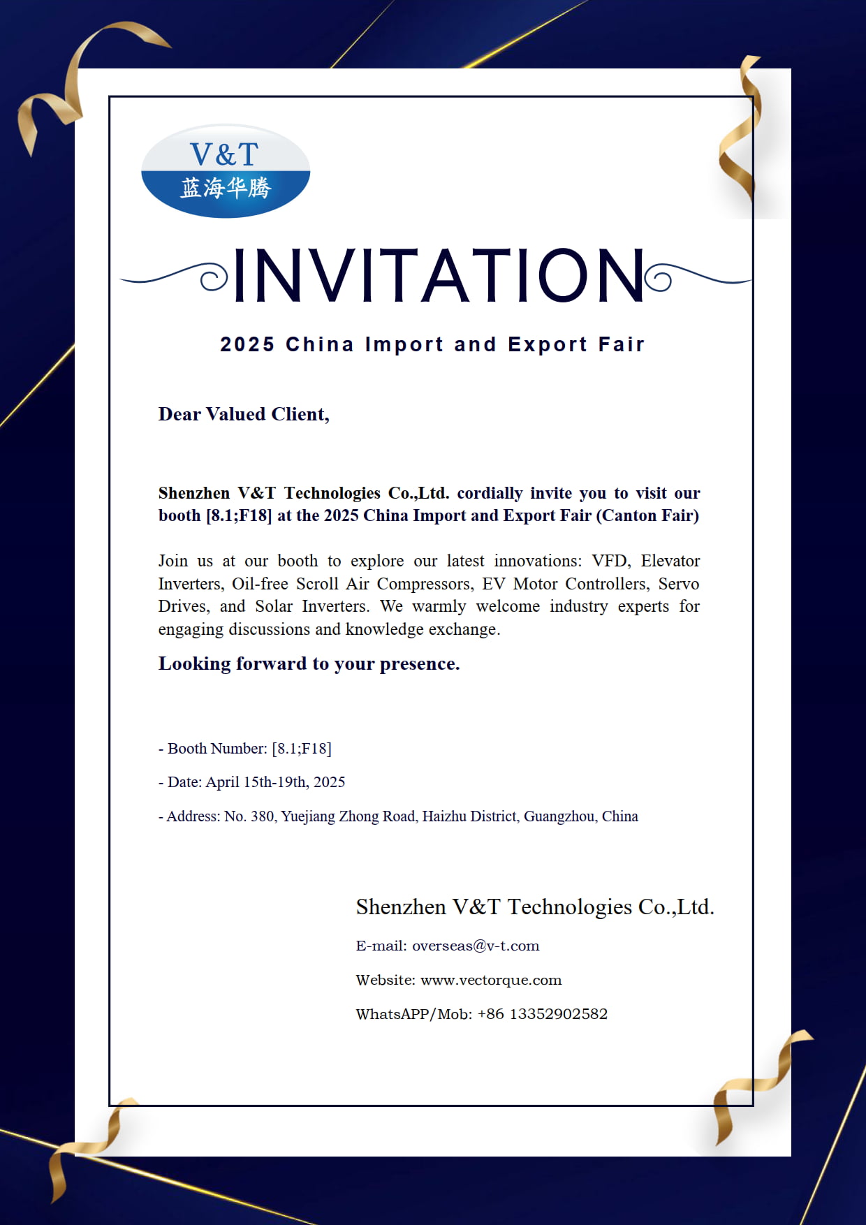 Shenzhen V&T Technologies Co., Ltd. invitarte cordialmente a visitar nuestro stand [8.1; F18] en el 2025 Feria de importación y exportación de China (Feria de Canton)