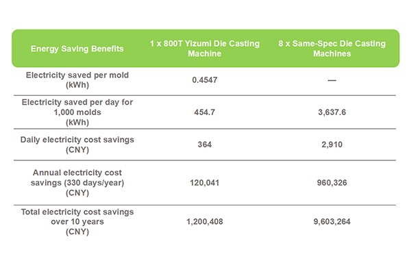 Based on 1,000 molds per day, 330 operating days per year, and an average electricity rate of CNY 0.8/kWh, the energy-saving benefits are calculated as follows: