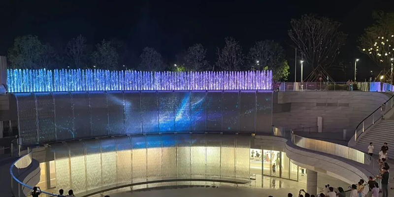 Los 13 canales de agua independientes de la fuente se controlan individualmente mediante variadores de frecuencia, lo que permite un ajuste de velocidad continuo. Esto posibilita diversas formaciones de agua, desde majestuosas cascadas en forma de cortina hasta suaves corrientes, creando una experiencia visual con múltiples capas.